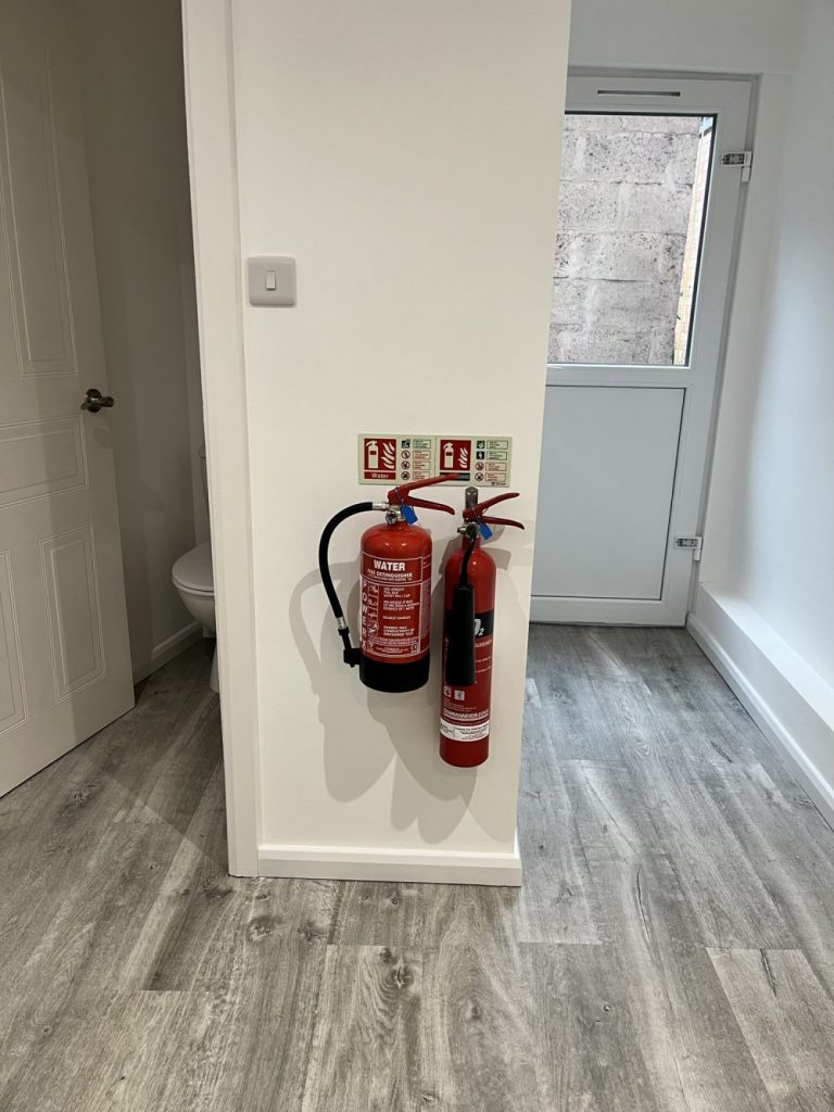 After discussing the portable fire extinguisher assessment with the ‘Responsible Person’, it was recommended two fire extinguisher points consisting of 1 x 3-Litre Water Additive (13A BSI Kitemarked UKCA) and 1 x 2KG CO2 Carbon Dioxide (34B BSI Kitemarked UKCA) extinguishers were to be installed, to provide suitable and sufficient first-aid fire-fighting cover for the identified fire risks (wood, paper & textiles and electrical) present throughout the unit area, allowing for ‘aiding escape’ from the unit in the event of fire.
